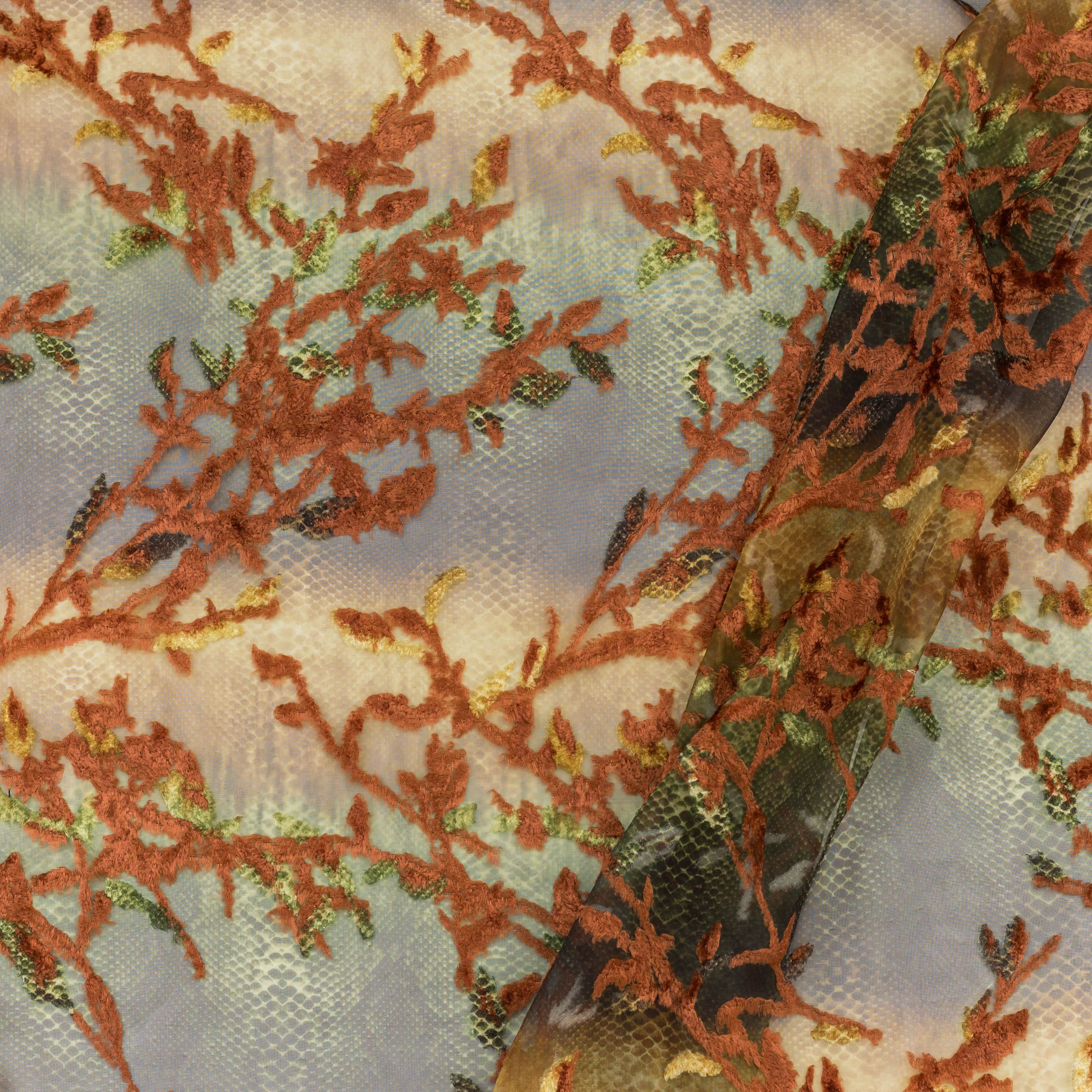 Το ύφασμα έχει φλοράλ σχέδιο με κλαδιά και φυλλώματα σε έντονη καφέ/λαδί απόχρωση, κεντημένα επάνω σε βάση με tie-dye εφέ. Η βάση παίζει σε λαδί, χρυσό, πράσινο και καφέ τόνους, με διακριτική υφή που θυμίζει snake print.