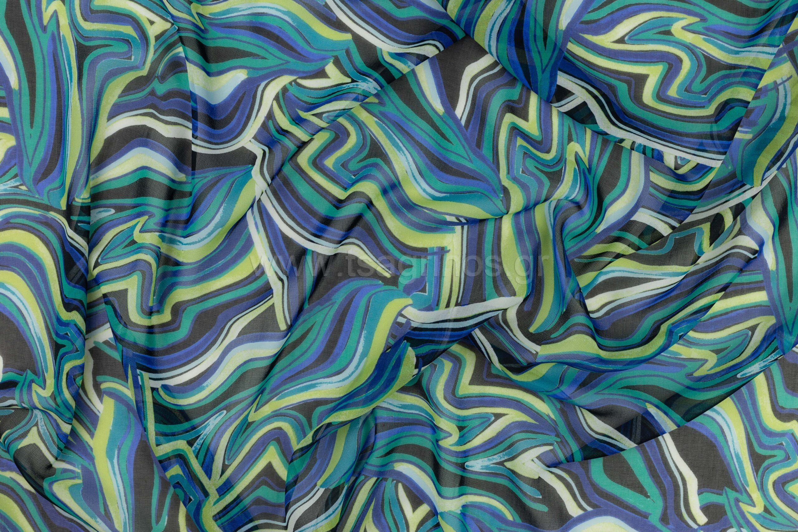 Ύφασμα μουσελίνα με σχέδιο ακανόνιστα κύματα. Είναι ένα πολύ δροσερό, ελαφρύ, με ωραίο ”πέσιμο” αλλά ταυτόχρονα αέρινο ύφασμα, με διαφάνεια και υπέροχη μεταξένια αίσθηση. Ράβεται πουκάμισο, τοπ, φόρεμα, τουνίκ, εσάρπα, φουλάρι, παρεό, παντελόνα καθώς και πολλών ειδών κατασκευές. Είναι κατάλληλο για χρήση όλες τις εποχές.