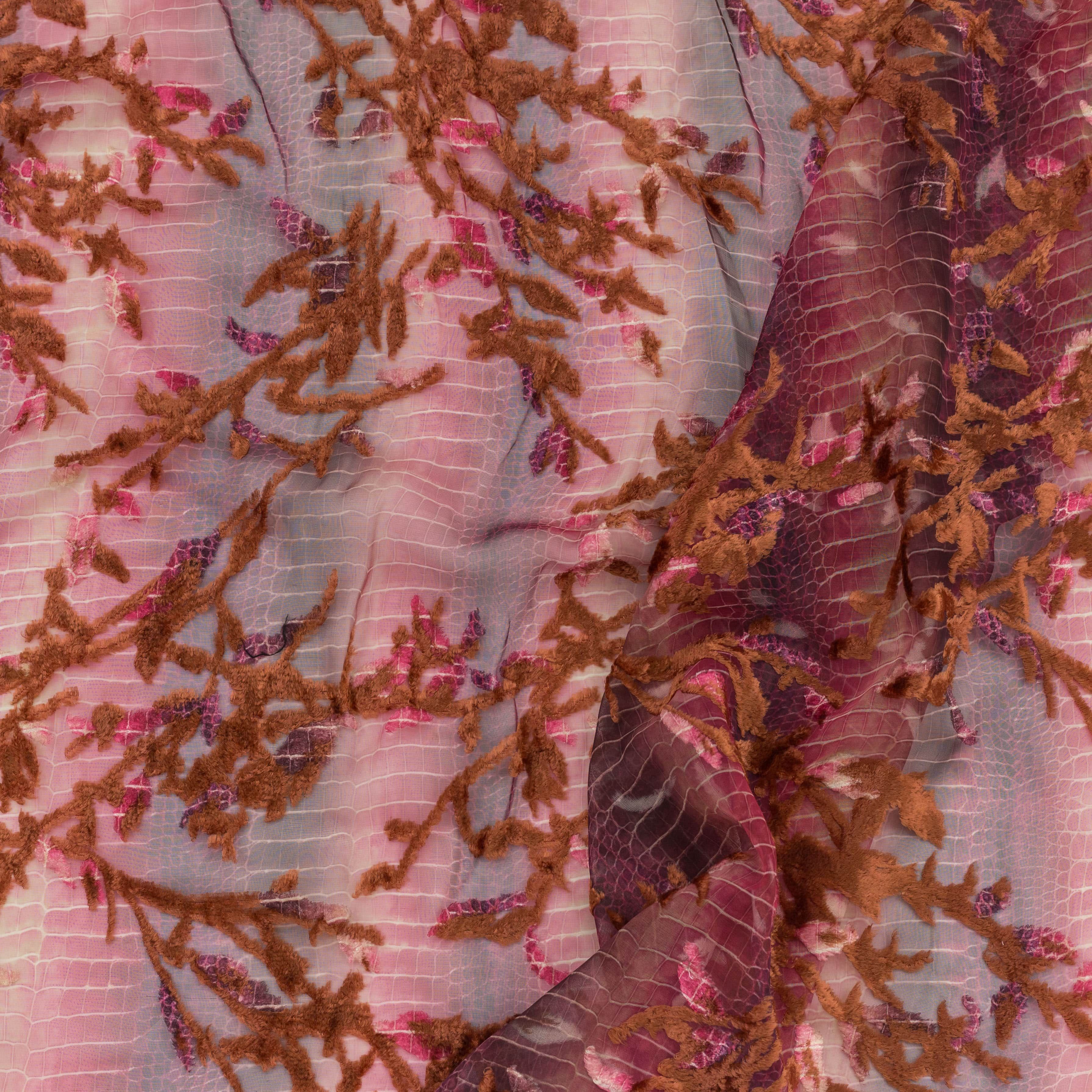 Το ύφασμα έχει φλοράλ σχέδιο με κλαδιά και φυλλώματα σε έντονη καφέ/βυσσινί απόχρωση, κεντημένα επάνω σε βάση με tie-dye εφέ. Η βάση παίζει σε ροζ, λιλά και καφέ τόνους, με διακριτική υφή που θυμίζει snake print.